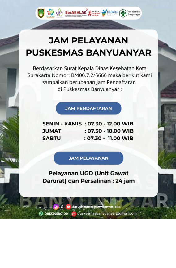 Senin - Kamis : 07.00 - 15.00 WIB Jum'at : 07.00 - 11.30 WIB Sabtu : 07.00 - 12.00 WIB